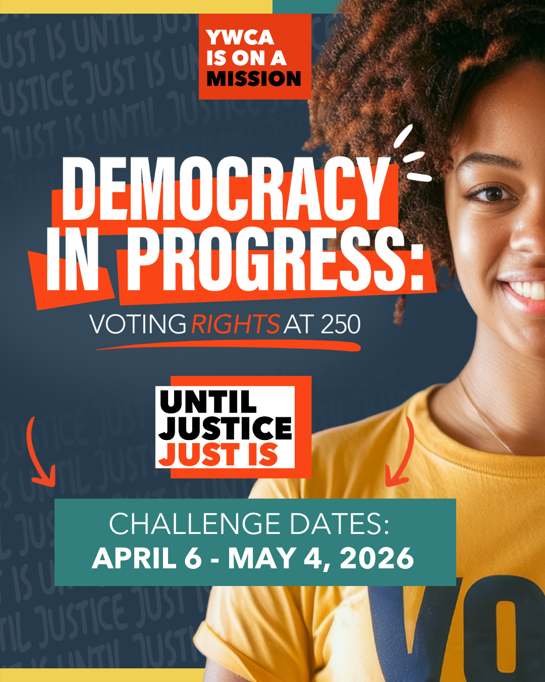 Join us and YWCAs across the country for the Until Justice Just Is Challenge from April 6 – May 4 as we learn, mobilize, and defend American’s access to the ballot. Participants will receive one thoughtfully curated piece of content each day—an article, video, podcast, or action step—designed to deepen understanding and inspire meaningful engagement.